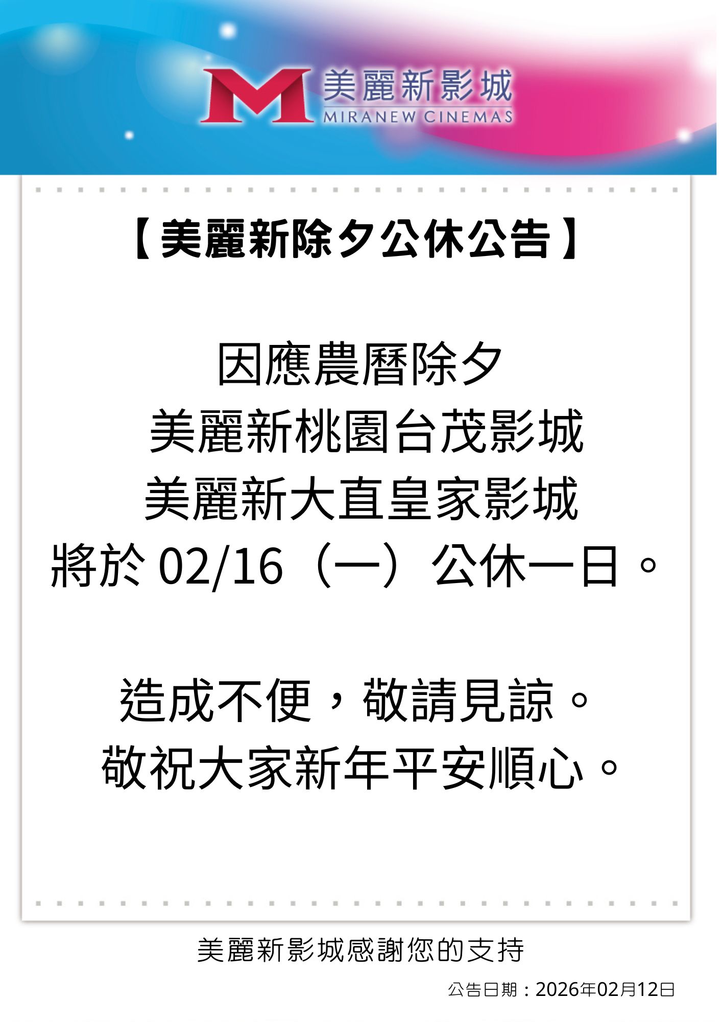 美麗新除夕公休公告